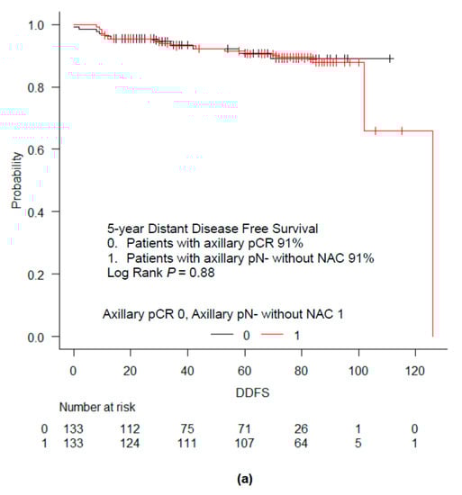 To examine the clinical relevance of axillary pCR, we compared survival outcomes between patients with axillary pCR and those with axillary pN- without NAC, using propensity score matching. For the control, we enrolled patients with pT1-4 pN0 M0 breast cancer who underwent surgery without NAC (Figure 1). The variables used for propensity score matching included menopausal status, clinical T stage, ER status, HER2 status, and NG. Propensity score matching resulted in 133 patients in each group. The baseline characteristics of each group showed no significant difference between the two groups except for radiotherapy and systemic therapy (Table 4), which was expected because nodal status is an important factor for the decision of radiotherapy and systemic therapy. We compared DDFS and OS between the matched groups (Figure 3a,b). The 5 year DDFS rate was 91% for both patients with axillary pCR and those with axillary pN- without NAC. The 5 year OS rate was 95% for patients with axillary pCR, and 92% for those with axillary pN- without NAC. The log-rank test showed no significant difference in DDFS and OS between the two groups.