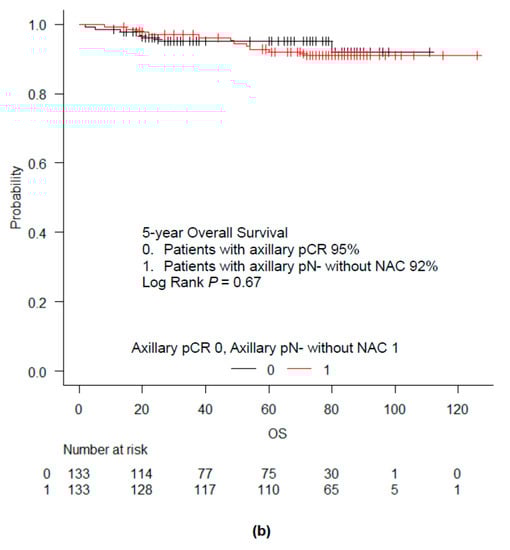 Neoadjuvant chemotherapy (NAC) is one of the standard treatment strategies for operable invasive breast cancer, especially for patients with node-positive breast cancer in all subtypes [,,,,,,,,,]. Various studies have demonstrated that axillary LN pathological complete response (pCR) after NAC is associated with improved prognosis in patients with clinically node-positive disease [,,,,,]. However, it is unknown whether patients with cytologically proven axillary node-positive breast cancer, who achieve axillary pCR after NAC have comparable prognosis to those with pathologically axillary node-negative disease who did not receive NAC. This study aimed to clarify the clinical impact of axillary pCR after NAC on survival, and to compare survival outcomes between cytologically proven node-positive breast cancer patients with axillary pCR and those with axillary pathological node-negative disease (pN-) without NAC using propensity score matching to adjust for baseline characteristics other than nodal status.