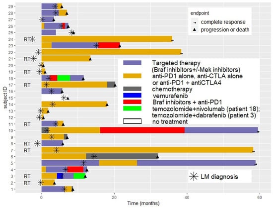 Among the 27 systemically treated patients after LM diagnosis, 17 patients (59%) were treated with immunotherapy (5 with ipilimumab, 7 with anti-PD1 and 5 with nivolumab + ipilimumab), 5 patients (17%) received targeted therapy (BRAF inhibitor alone for 3 patients and BRAF + MEK inhibitors for 2 patients), 1 was treated with chemotherapy (temozolomide), and 4 patients (14%) were treated with anti-PD1 in combination with BRAF inhibitor.