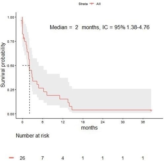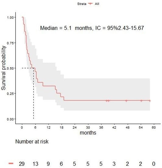 Median OS was 7.1 months (range 3.8 to not reached) for the 9 patients receiving cRT and 3.2 months (2.1–15.1) for the 20 patients not receiving cRT.