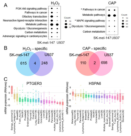 Pathway analysis of genes deregulated by H2O2 and CAP. (A) KEGG pathway analysis of genes regulated by H2O2 or CAP. Pathways observed in both U937 and SK-mel-147 cells are shown. The larger the size of the circle, the more genes included in the pathway. The ‘MAPK pathway’ and ‘Pathways in cancer’, which include PTGER3 and HSPA6 from CAP-treated cells, are indicated with an asterisk (*). (B) Venn diagram of common genes regulated in U937 and SK-mel-147 cells by H2O2 or CAP. There were four and two common genes significantly altered by H2O2 and CAP, respectively, in both cells. (C) Expression profile of PTGER3 and HSPA6 in various tumors. The expression level of the genes was extracted from the CCLE database and aligned with the box plot. The horizontal line indicates the expression level of control normal tissues. The numeric value in the parenthesis represents the number of examined tissues.