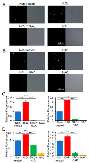 Production of reactive oxygen species (ROS) by H2O2 and CAP in U937 cells. U937 cells were treated with H2O2 or CAP with N-acetyl-L-cysteine (NAC), and the fluorescence intensity was observed using a microscope. Fluorescent images were obtained after treating the cells with (A) H2O2 and NAC or (B) CAP and NAC. Bright-field microscopy images are shown next to fluorescent images. Experiments were performed in triplicate, and representative images are shown. The bar graph shows the fluorescence intensity measured by ImageJ (C) and a microreader (D) (mean ± SE). Relative intensity of samples to the non-treated is indicated. ** p < 0.01, *** p < 0.001.