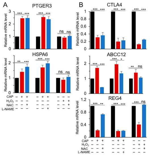 The regulation of the six genes that were identified as H2O2- or CAP-specific regulated genes (Figure 2B and Table S2) was further validated by RT-qPCR, except for MEG3, which was a long non-coding RNA. As shown in Figure 4A, PTGER3 and HSPA6 were upregulated in CAP-treated cells, which did not occur in H2O2-treated cells. Their upregulation was not significantly affected by either NAC or L-NAME (a NOS inhibitor), suggesting that the regulatory effect of CAP on both genes was not mediated by ROS or RNS. The deregulation of the three genes CTLA4, ABCC12, and REG4, which had been identified from the microarray data of H2O2-treated cells, was confirmed by RT-qPCR. A similar result was observed in CAP-treated cells, and their expression was restored by NAC (Figure 4B). L-NAME attenuated the effect of H2O2 and CAP on the expression of CTLA4 and ABCC12; however, there was no significant effect for REG4 expression. Ar gas alone did not induce a significant change of the gene expression compared to non-treatment (Figure S2). These results suggest that CTLA4 and ABCC12 may be regulated by ROS and RNS; however, REG4 may be regulated only by ROS.