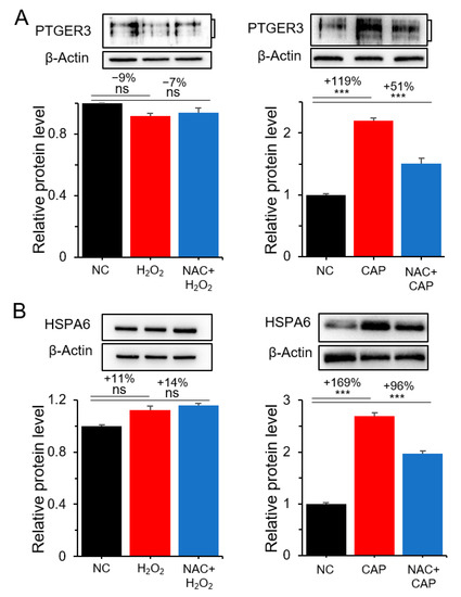 PTGER3 is a G protein-coupled receptor for prostaglandin E2 (PGE2), which exerts its effects through downstream components of cell proliferation pathways such as MAPK/Erk [37]. The aberrant lower expression of PTGER3 has been associated with the biological hallmarks of several malignancies with negative clinical outcomes [46]. HSPA6, a member of the HSP70 family, is a ubiquitous molecule within cells that acts as a molecular chaperone under conditions such as stress, including carcinogenesis. The protein is overexpressed in various carcinoma types and may be correlated with aggressiveness and prognosis [47,48]. In contrast, extracellular HSP70 results in ROS production, which might initiate tumor cell necroptosis. HSPA6 was also reported to inhibit the proliferation and invasion of garlic extract-treated bladder cancer cells [38]. Although the expression of the two genes was not affected by either H2O2 alone or co-treatment with NAC, it was upregulated by CAP, which was attenuated by NAC. This suggests that ROS other than H2O2 in CAP may contribute at least in part to expression regulation. Previous studies indicated that multiple genes are regulated by either superoxide or nitric oxide. However, no study related to PTGER3 or HSPA6 is available. The use of other types of ROS or RNS and their inhibitors should help identify the responsible constituents. In the case of PTGER3, multiple sizes of isoforms are synthesized from a single gene [49]. Each RNA could be differentially regulated at the post-transcriptional level such as RNA stability or translational efficiency. This could be in part an explanation for the differential regulation of RNA and protein by CAP and NAC.
