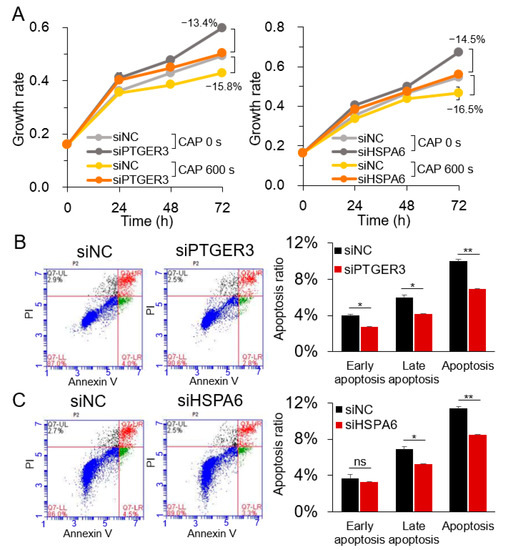 The CAP-specific but not H2O2-specific regulation of PTGER3 and HSPA6 was further examined by the Western blot analysis. As shown in Figure 5 and Figure S3, their expression was not significantly affected by H2O2 and NAC. However, the expression of the genes was increased by 119–169% by CAP, which was only partially suppressed by NAC, suggesting the presence of non-ROS constituents in CAP regulating PTGER3 and HSPA6. To determine whether PTGER3 and HSPA6 are involved in the inhibitory effect of CAP on cell proliferation, the cell growth of U937 cells was monitored after treatment with gene-specific siRNAs. The result showed increased cell growth following treatment with siRNAs for both PTGER3 and HSPA6 compared to the control siRNA, which was attenuated by CAP (Figure 6A, Figure S1, and Table S1). Subsequently, the siRNA-treated cells were analyzed for apoptosis. Apoptosis was decreased by 31% and 26% in cells treated with siRNAs for PTGER3 and HSPA6 compared to cells treated with the control siRNA, respectively (Figure 6B,C). These results suggest that PTGER3 and HSPA6 stimulated U937 cancer cell growth, which may be inhibited by the non-ROS and non-RNS constituents of CAP.