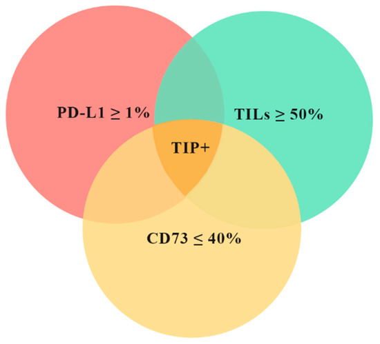 To better identify patients more prone to achieve a pCR, we combined together the results of the assessment of the above features to construct a tissue immune profile (TIP). A patient was considered TIP positive (TIP+) based on the combination of TILS ≥ 50%, PD-L1 ≥ 1% on IC and CD73 ≤ 40% on CC in the pre-NACT biopsy (Figure 2).