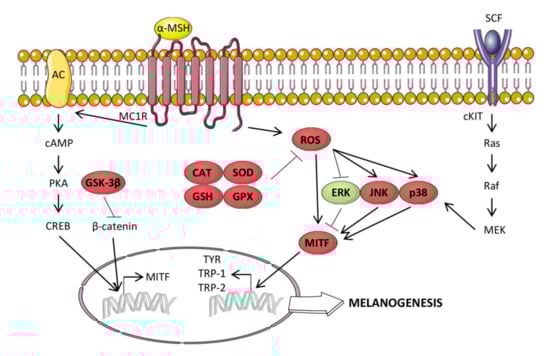 - Chao, W.W.; Su, C.C.; Peng, H.Y.; Chou, S.T. Melaleuca quinquenervia essential oil inhibits α-melanocyte-stimulating hormone-induced melanin production and oxidative stress in B16 melanoma cells. Phytomedicine 2017, 34, 191–201. [Google Scholar] [CrossRef] [PubMed]