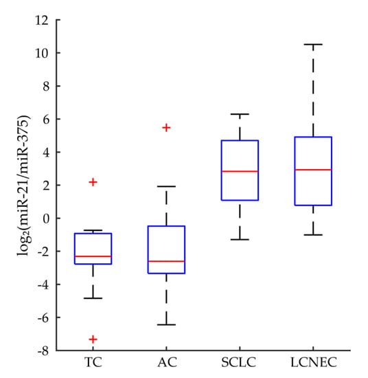 Ratio of miR-21 and miR-375 expression in lung NENs. Log2 transformed ratios of miR-21 and miR-375 expression were assessed in all samples. Ratios were significantly lower in carcinoids than NECs (MWW, U = 66.0, p < 0.001, r = −0.825). Red crosses denote statistical outliers. Abbreviations: typical carcinoid (TC), atypical carcinoid (AC), small cell lung carcinoma (SCLC), large cell neuroendocrine carcinoma (LCNEC).