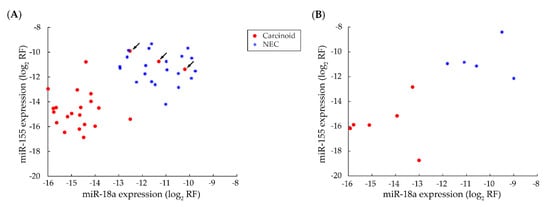 Scatter plot assessment of selected individual miRNAs for discriminating carcinoids from neuroendocrine carcinomas (NECs). Carcinoids and NECs were discriminated using miR-18a and -155, with three misclassifications in the discovery set (A) and no misclassification in the validation set (B). Abbreviation: log2 normalized relative frequency (log2 RF).