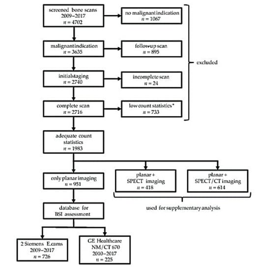 The data of 4702 patients referred to our department (Department of Radiology and Nuclear Medicine, University Hospital Magdeburg, Magdeburg, Germany) with a clinical indication for a bone scan between January 2009 and December 2017 were retrospectively screened for analysis. Standardized eligibility criteria were defined as follows to guarantee a comparable data quality for the validation procedure. Patients with suspicion of benign disorders (n = 1067), e.g., loosening of joint prosthesis or rheumatic affection, were excluded from further analysis. Only the first whole-body scan of each patient during the observed period was included in the analysis (n = 2740). Some data were excluded due to methodological constraints, e.g., an incomplete whole-body scan or signs of extravasation (n = 24). Final count statistics had to exceed 1.0 million counts in the geometric mean image, calculated from anterior and posterior projections (n = 733 examinations excluded), to ensure the good reliability of the BSI [26]. SPECT/(CT) was performed additionally (n = 1032) for localization of suspect tracer accumulation. Corresponding clinical reports presented the condensed information from planar imaging and SPECT/(CT). As a result, for these patients, the classification could have been biased by findings from SPECT/(CT). Patients with SPECT/(CT) data were excluded from primary evaluation because BSI evaluation is based on planar images only (effect from SPECT/(CT); Table S1). Finally, we analyzed a total of 951 bone scans (Figure 1).