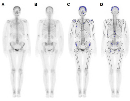 Finally, the BSI is correlated with prognosis and likelihood of response to various therapies in patients with metastatic prostate cancer [40,41,42,43]. The extension of BSI to other tumor entities may open novel opportunities in feature extraction using deep learning technology for observer-independent response prediction and individual prognostication. Although other imaging modalities, in particular PET, were proven to be superior to regular planar bone scans [1,7], lower costs, faster acquisition, and greater availability are reasons why planar bone scan preserves its importance in whole-body skeletal examination. Therefore, this imaging modality still needs to be further improved, e.g., by using automated quantification tools integrating multiparametric data.