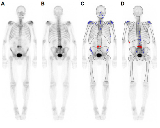 (A,B) Bone scan of a male patient with colorectal cancer and (C,D) results from atlas-based segmentation. Three lesions were correctly identified as osseous metastases (lumbar spine and left rib, red labeled). The malignant character is in accordance with the medical report (BSI = 0.54%). Additional benign lesions were labeled in blue; (A,C: anterior projection; B,D: posterior projection).