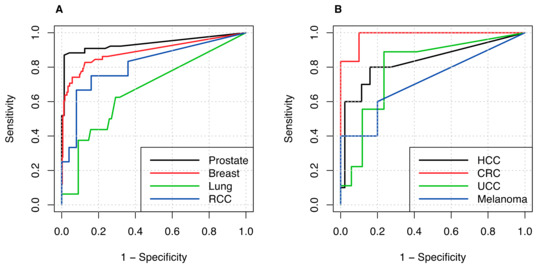 ROC curves: (A) tumor entities with osteotropic potential: prostate cancer, breast cancer, lung cancer, and kidney cancer, and (B) HCC, CRC, UCC, and melanoma. ROC, receiver operator characteristics; RCC, renal cell carcinoma; HCC, hepatocellular carcinoma; CRC, colorectal cancer; UCC, urothelial cell carcinoma.
