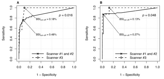 ROC curves for (A) breast cancer and (B) prostate cancer, illustrating the scanner-specific influence on BSI methodology. The plotted marker (points, stars) reflect the respective best BSI cut-off value for each scanner model.