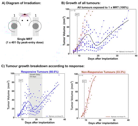 Tumour response after single Microbeam Radiation Therapy (MRT) (1 × 401.23 Gy). Melanomas in the ear of mice were exposed to a single MRT array of 401.23 Gy peak dose and 7.4 Gy valley dose, delivered nine days after tumour cell implantation. (A) Diagram of the irradiation modality; (B) Tumour growth of all melanomas after the single MRT; (C) Breakdown of the melanomas according to their treatment response; tumours exhibiting shrinkage and consecutive regrowth with a measurable growth delay were called “Responsive Tumours”, while melanomas that did not shrink after MRT were called “Non-Responsive Tumours”. A non-linear biphasic fit was used to model the growth.