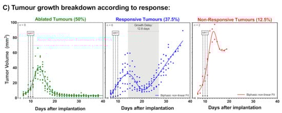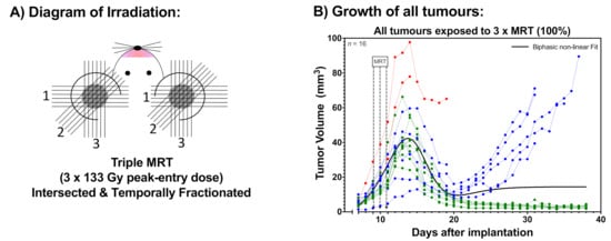 In contrast, Figure 2B shows the growth of all B16-F10 melanomas exposed to three fractions of MRT (3 × 133.41 Gy). These tumours were also retrospectively analysed and re-classified into three distinct categories (Figure 2C): (i) those that experienced complete remission (50%; ablated tumours, in green), (ii) those that exhibited a mean growth delay of 12.8 days (37.5%; responsive tumours, in blue), and (iii) those that did not show tumour shrinkage (12.5%; non-responsive tumours, in red).