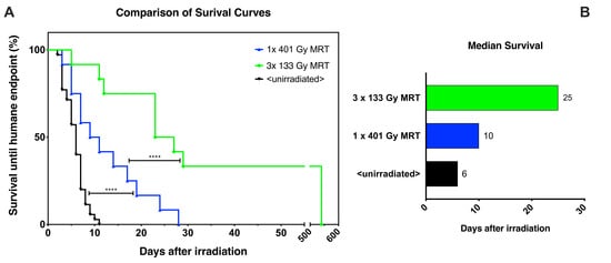 Mice exhibiting complete remission did not show behavioural abnormalities, and no organ metastasis were detected. We ended the experiment 18 months after treatment (540 days) and during this time, the mice did not have behavioural abnormalities nor signs of cancer. Figure 3A depicts animal survival with results indicating that the treatment response favours the triple fractionation of MRT, with statistical significance computed by the Gehan–Breslow–Wilcoxon test, which gives extra weight to early timepoints (p < 0.001). Further analysis revealed a 2.5-fold increase in the median survival after three fractions of MRT (Figure 3B). Figure 3 also includes data from our previously published experiment [] showing the survival of mice harbouring unirradiated melanomas (<unirradiated>). Taking into consideration the growth of unirradiated tumours, the temporally fractionated MRT scheme increased the median survival by 4.1-fold.