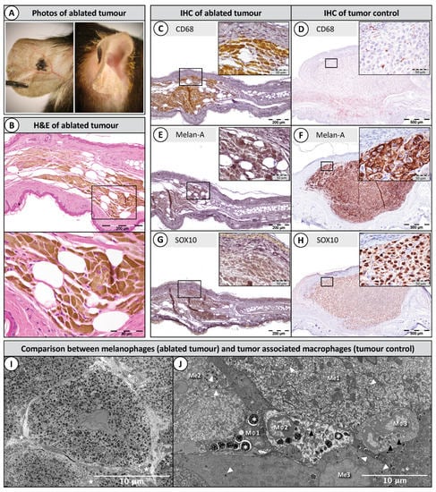 Histopathology of ablated tumours (3 × 133.41 Gy). (A) A picture of the remaining nevus 18 months after MRT. (B) The nevus was formed by melanin-laden cells; (C,E,G) the ablated tumours stained immunohistochemically (IHC) and immediately bleached with trichloroisocyanuric acid (TCCA) to eliminate the excess of melanin; positive staining is shown with the 3,3′-Diaminobenzidine chromophore (DAB) as a bright yellow colour. Melanin-laden cells were positive for the macrophage marker CD68 (C), while they were negative for two melanoma markers: Melan-A (E) and SOX10 (G); (D,F,H) are positive controls in a melanoma harvested 10 days after implantation (not bleached); positive staining is shown with the NovaRED chromophore; (I) the ablated tumour under transmission electron microscopy revealed that the melanophages were packed with melanin and separated by dense collagen fibres (stars); (J) a group of macrophages (MΦ 1, 2, 3) in between melanoma cells (Me 1, 2, 3) 6 days after a single MRT. Macrophages contain numerous primary lysosomes (black arrowheads) and secondary lysosomes (asterisks). Melanin granules are indicated with white arrowheads.