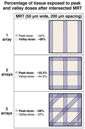 Intersecting the MRT arrays changes the total percentage of tissue exposed to peak and valley doses. This figure is a two-dimensional schematic representation of the geometrical distribution of three intersecting MRT arrays (microbeams 50 μm in width, 200 μm spacing) in a squared piece of tissue. As the number of intersecting arrays increases from one to three, the percentage of tissue exposed to peak doses increases in an inversely proportional matter to the percentage of tissue that remains exposed to valley doses.