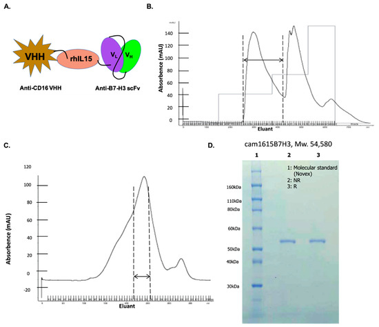 In order to construct a second-generation TriKE capable of both ADCC and NK cell expansion, we modified our previously reported TriKE platform [22]. A wild-type human IL-15 crosslinker with two modified flanking regions was inserted between two antibody fragments—an n-terminal VHH humanized camelid anti-CD16 fragment [23] and a c-terminal anti-B7-H3 fragment [27]—creating cam1615B7H3. Figure 1A shows a schematic of the B7-H3 TriKE construct. Figure 1B shows the absorbance tracing from the FFQ ion exchange column as the first phase of the purification with the eluant collected in 8-mL aliquots shown on the abscissa of the graph. The double-sided arrow shows the collection peak as drug exits the column. Figure 1C shows the absorbance tracing from the second purification phase, size exclusion chromatography (SEC). The first peak off the column was collected and the various drug containing fractions were pooled and analyzed using SDS-PAGE with Comassie Blue staining for the presence of a uniform product (Figure 1D). The final product was greater than 90% pure with a molecular weight of about 55 kDa; the predicted molecular weight was 54.58 kDA. As with other TriKE molecules, this TriKE is expected to have a rapid clearance profile due to its size, with EC50 ranges in the order of a couple of hours [23].