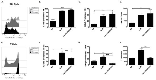 The wild-type IL-15 moiety in the cam1615B7H3 TriKE is designed to induce targeted delivery of a proliferative signal to NK cells. To test this, we carried out proliferation assays evaluating dilution of a CellTrace dye over a 7-day period on PBMCs treated with no treatment (NT), monomeric rhIL-15 (IL15), or the TriKE (cam1615B7H3). At the end of the seven days, cells were harvested and proliferation was evaluated by gating on CD56+CD3− cells. While no treatment (NT) resulted in low proliferation with low NK cell numbers, the cam1615B7H3 induced an overall increase in proliferation that was similar in amplitude to that induced by rhIL-15 (Figure 2A–D), with no significant differences between those two groups. Since IL-15 acts on both NK cells and T cells, specificity was evaluated next by gating on T cells (CD56−CD3+). Minimal T cell proliferation was seen in the TriKE treatment group in contrast to rhIL-15, which induced robust proliferation of T cells (Figure 2E,F) clearly showing that the cam1615B7H3 TriKE IL-15 delivery was more restricted to NK cells. This differential was particularly notable in robustly proliferating populations (past three divisions), where the cam1615B7H3 TriKE showed significantly less proliferation than the untreated group (Figure 2G), while T cell numbers did not differ between the untreated and TriKE-treated groups (Figure 2H). This data indicates that the cam16 engager in the cam1615B7H3 TriKE is specifically delivering IL-15 to NK cells and not T cells.