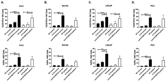 cam1615B7H3 TriKE enhances NK cell function of healthy donors (black bars) and prostate cancer patients (white bars) against prostate tumor targets. Pooled analysis of proportion of NK cells from healthy donors or prostate cancer patients expressing CD107a+ (top) or IFNγ (bottom) against (A) C4-2, (B) DU145, (C) LNCaP, and (D) PC3 targets (N = 9 for healthy donors, N = 3 for patients). * p < 0.05, ** p < 0.01, *** p < 0.001, and **** p < 0.0001.