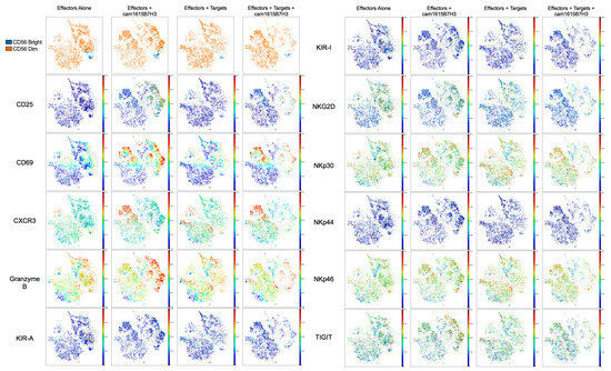 High dimensional analysis of cam1615B7H3 activated NK cells. Concatenated analysis of three donors PBMCs incubated alone, with 30 nM cam1615B7H3 TriKE, with OVCAR8 tumor (2:1 E:T), or with 30 nM cam1615B7H3 TriKE and OVCAR8 tumor. Data was visualized in viSNE (Cytobank) and gated on CD45+CD56+CD3− cells. With the exception of the CD56 plot, color represents protein intensity (red = highest, and dark blue = lowest).