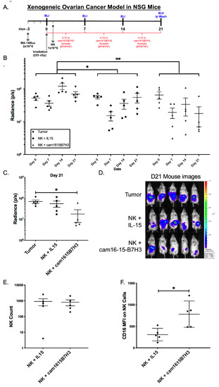 cam1615B7H3 TriKE is efficacious in subduing ovarian tumor progression in vivo. (A) Diagram showing Xenogeneic ovarian cancer MA-148-Luc model in female NSG mice (N = 5 per treatment group). (B) Bioluminescent imaging indicative of tumor progression, measured as Total flux radiance (p/s), over three weeks in the MA148 mouse model treated with enriched NK cells and noted treatments. (C) Bioluminescent imaging results on day 21 data point. (D) Graphed total flux radiance (p/s) on day 21. (E) Scatter plot of CD56+CD3− NK cell numbers from peritoneal lavages for the rhIL-15 and cam1615B7H3 TriKE treatment groups at D21. (F) Scatter plot of CD16 media fluorescence intensity on NK cells from peritoneal lavages for the rhIL-15 and cam1615B7H3 TriKE treatment groups at day 21. * p < 0.05, ** p < 0.01.