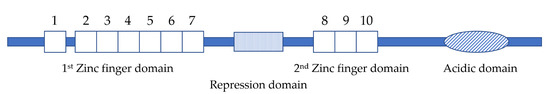 EVI1 protein structure. The numbered boxes indicate individual zinc fingers. The dotted box indicates the proline-rich repression domain. The oval indicates the acidic domain.
