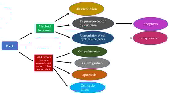 Studies by Yamakawa et al. [91] showed that overexpression of EVI1 inhibits cell growth and causes cells to accumulate in the G0 phase in. Konrad et al. [92] showed that induction of either EVI1 or MDS1/EVI1 inhibits cell proliferation by slowing the transit through the cell mitotic cycle. Induction of either protein drives cells to accumulate at the G0/G1 phase and moderately increased the rate of spontaneous apoptosis. Overexpression of EVI1 in U20S cells induced the accumulation of supernumerary centrosomes in cells and resulted in a cell cycle arrest in the G0/G1 phase. In addition, EVI1-overexpressing cells showed higher levels of cyclin D1 and p21, reduced Cdk2 activity and activated p53 pathway [93,94]. These data suggest that EVI1 may play a role in cell quiescence.
