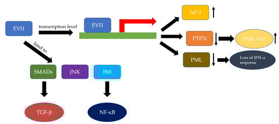 EVI1 completely abrogates the anti-proliferative and apoptotic effects of IFN-α in hematopoietic cells [34]. EVI1 prolongs STAT1 phosphorylation and binding to the first exon of promyelocytic leukemia protein (PML), thereby repressing PML transcription and preventing the activation of PML-dependent apoptotic pathways, resulting in the loss of IFN-α response [34].