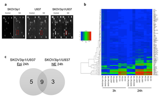 To characterize changes in pro-inflammatory networks induced by adrenergic signaling, we analyzed cytokine/chemokine protein expression in supernatants from an ovarian cancer cell/macrophage (SKOV3ip1/U937) co-culture system exposed to epinephrine (Epi) or norepinephrine (NE) (Figure 1a,b). First, SKOV3ip1 monocultures treated with Epi or NE for 3 h (hrs) showed no significant difference in cytokine expression from their respective untreated controls. However, longer exposure of monocultures to stress hormones demonstrated significant changes in cytokines expression compared to untreated controls. SKOV3ip1 monoculture exposure to Epi and NE for 24 h showed significant upregulation in expression, 63, and 95 cytokines, respectively (Table S1).