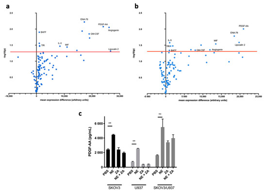 Cytokine profile of adrenergic stimulated ovarian cancer cells/macrophage co-cultures (a) Volcano plots showing cytokine changes of SKOV3ip1and U937 co-cultures 24 h after Epi or (b) NE treatment. The Y-axis depicts the two-class comparison’s statistical significance in –log notation of the t-test’s p-value. Thus, the higher the dot, the higher the statistical significance. The X-axis depicts expression compared to monoculture conditions. The farther to the right, the higher the expression. The red line marks the threshold for statistical significance established at p < 0.05. Cytokines labeled are shared between Epi and NE groups. (c) Zoledronic acid (ZA) prevents NE-induced platelet-derived growth factor AA (PDGF-AA) release in SKOV3 and U937 monocultures and SKOV3/U937 co-cultures. Mean ± SEM. ** p < 0.01.