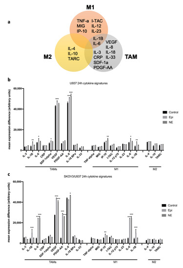 In order to understand the potential role of the different subtypes of macrophages under adrenergic stimuli, we analyzed changes in subsets of cytokine signatures in our U937 monoculture and SKOV3ip1/U937 co-culture systems. Here, we utilized existing data from ovarian carcinoma immune profiling studies [16,17,18] to determine if there are changes in cytokine signatures suggestive of M1, M2, and TAMs phenotypes (Figure 3a). The results show that NE-treated SKOV3ip1/U937 co-cultures express significantly more factors from a TAMs signature compared to NE-treated U937 macrophages alone. In addition, these robust changes in cytokine expression profiles were not clearly observed in M1 and M2 signatures. (Figure 3b,c).