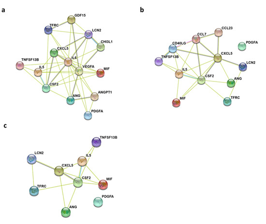 Protein-protein interaction network between differentially expressed cytokines in ovarian cancer–macrophage co-cultures. (a) Epi 24 h (b) NE 24 h and (c) shared cytokines between Epi and NE 24 h treatment. Each node represents a protein, and the edges linking nodes represent known interactions between the two proteins.