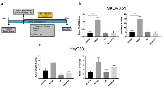 Zoledronic acid (ZA) abrogates restraint stress-induced ovarian cancer tumor growth in an orthotopic Nu/Nu mice model. (a) In vivo ovarian cancer orthotopic model timeline (b) Tumor weight and tumor nodules in an orthotopic SKOV3ip1 and (c) HeyT30 mice model. Stress groups were subjected to daily restraint stress (2 hrs/day), while ZA treatment was administered weekly. Mean ± SEM. * p < 0.05 ** p < 0.01 *** p < 0.0001.
