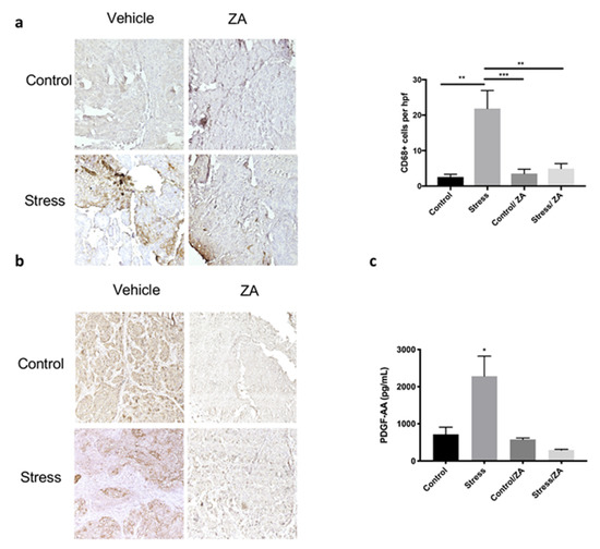 After sacrifice, we proceeded to verify macrophage infiltration in formalin-fixed tumor samples from the restraint stress model through CD68 immunohistochemical staining (Figure 6a; p < 0.01). Restraint stress increased CD68+ macrophage infiltration into SKOV3ip1 tumors (21.86 CD68+ cells/high-power field (HPF)), and this effect was abrogated by ZA treatment (4.941 CD68+ cells/HPF). Thus, demonstrating ZA was able to prevent the effects of restraint stress by inhibiting macrophage infiltration.