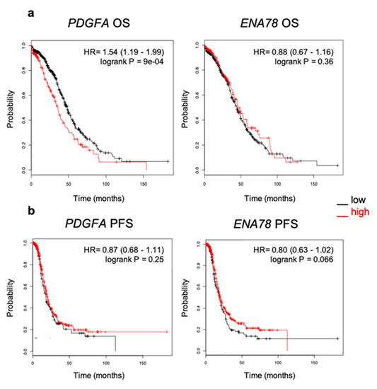 Kaplan–Meier Plotter Online Tool (KMPlotter; http://kmplot.com, Budapest, Hungary) was used to analyze the relationship between gene expression and ovarian cancer patient clinical outcomes [20]. We investigated overall survival (OS) and progression-free survival (PFS) in patients with high and low expression of PDGFA and ENA78 (CXCL5) (Affymetrix IDs: 205463_s_at and 215101_s_at, Thermo). The analysis was restricted to ovarian cancer serous subtype and TCGA database. Hazard ratio (HR) with 95% confidence interval (CI) and log-rank p-value were retrieved from the online analysis. The threshold for significance was established at p < 0.05. HR = 1 indicates that there is no difference in survival between the two groups. HR > 1 or < 1 indicates that one of the groups had better survival than the other.