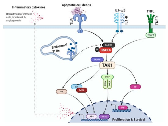 The Toll-like/Interleukin-1 receptor (TIR) and tumor necrosis factor receptor (TNFR) family members are the main triggers that drive the canonical NF-κB pathway in PDAC cells and CAFs. The TLR1-10 in humans specialize in sensing both damage-associated molecular patterns (DAMPs) and pathogen-associated molecular patterns (PAMPs) and are sentinels that initiate inflammation as part of the innate immune response. Engagement of TLRs results in cytoplasmic aggregation of adaptor proteins, including myeloid differentiation factor-88 (MyD88), TIR domain-containing adapter-inducing interferon-β (TRIF), TRIF-related adaptor molecule (TRAM), and sterile-α and armadillo motif-containing proteins []. Specifically, MyD88 oligomerizes with the closely homologous IRAKs, including IRAK1, IRAK2, and IRAK4, whereby IRAK4 phosphorylates IRAK1, leading to recruitment of TNFR receptor-associated factor (TRAF)6, transforming growth factor-β (TGF-β)-activated kinase 1 (TAK1), IKK complex, and activation of the NF-κB, p38/mitogen-activated protein kinases (MAPK) and type-1 interferon pathways []. Additionally, engagement of the TNFRs leads to recruitment of TRAF2, which polyubiquitinates and activates receptor-interacting protein kinase (RIPK), which in turn binds and activates TAK1 [,] (Figure 1). In the following sections, we will review the role of these pathways in PDAC.