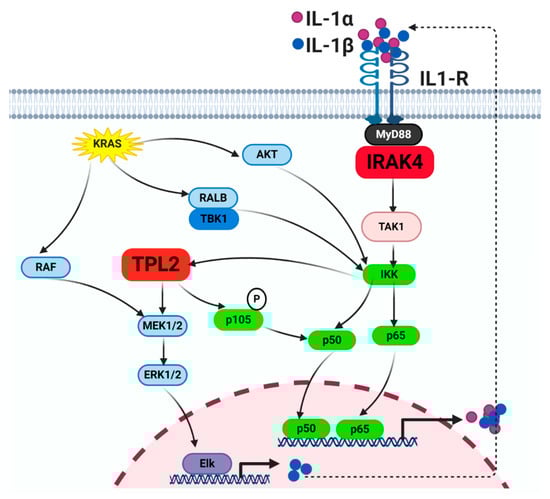 Contribution of the RAF-MEK-ERK cascade to the NF-κB cascade is indirect and mediated through autocrine IL-1β production. Through the RAF-MEK-ERK cascade, the KRAS oncoprotein markedly upregulates production of IL-1β, which, in an autocrine manner, engages the IL-1R-IRAK4-TPL2 axis to activate the canonical NF-κB pathway and further reinforces MEK-ERK activity []. Importantly, ablation of IRAK4 completely blocks KRAS-induced transformation and tumorigenesis []. In PDAC GEMM, oncogenic KRAS-driven progression to PDAC absolutely requires the autocrine IL-1α-IKKβ- NF-κB axis [], as deletion of IKKβ completely abrogated PDAC development in these mice. In support, ablation of IRAK4 completely abrogated RAS-induced transformation. Furthermore, NF-κB activation enhanced the activated level of KRAS mutant proteins as assayed by RAS-GTP levels, leading to accelerated PDAC development []. These studies widen the spectrum of oncogenic RAS signaling beyond the direct effectors and include inflammation as an equally critical component (Figure 2). Because targeting KRAS and its direct effectors, including the RAF-MEK-ERK and PI3K-AKT-mTOR cascades, remains largely unsuccessful, we propose that targeting key signaling nodes in the canonical NF-κB cascades could represent another promising anti-RAS strategy.