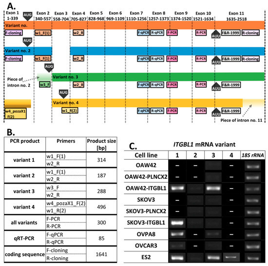 Except full size mRNA (variant 1 mRNA, NCBI Reference Sequence: NM_004791.2), three additional mRNA variants of ITGBL1 (variants 2–4: NM_001271755.1, NM_001271756.1, NM_001271754.2, respectively) have been computationally predicted (Figure 1A). For this reason, we evaluated the presence of all four ITGBL1 variants in different ovarian cancer cell lines (Figure 1B,C, and Figure 2B).