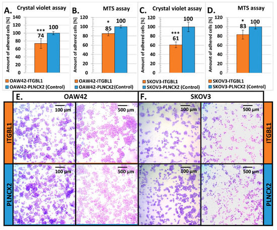 Evaluation of cellular attachment to the uncoated plastic surface. The amount of surface-attached cells was measured 5 min (OAW42) and 15 min (SKOV3) after seeding by crystal violet staining (A,C) and by MTS (B,D). Statistical significance was assessed with Student’s t-Test; * indicates p < 0.01, *** p < 0.001. Y-axis represents percentage of crystal violet/formazan released from fixed attached cells (mean ± SD, n = 3, each in 12 technical repeats). The amount obtained from control cells was taken as the reference value (100%). (E,F) Representative images of surface-attached cells, ITGBL1-overexpressing and control (crystal violet staining).