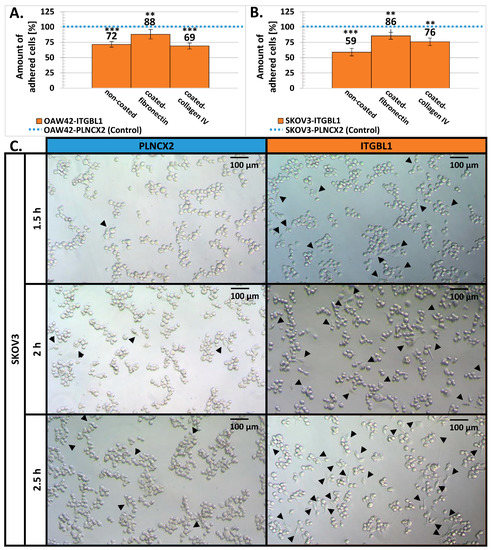We also analyzed initial cellular attachment to the surface coated with fibronectin or collagen IV (Figure 4A,B). Fibronectin coating partially abolished the effect of ITGBL1 overexpression, but adhesiveness of OAW42-ITGBL1 and SKOV3-ITGBL1 cells was still reduced in comparison to the control ones. Covering of the culture vessel surface with collagen IV had an ambiguous and cell line-dependent effect: in the case of OAW42, ITGBL1-overexpressing cells had even weaker attachment than to the uncoated surface, while in the case of SKOV3, ITGBL1-overexpressing cells attached stronger than to a bare surface, but weaker than to the fibronectin-coated one.