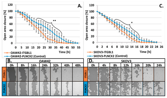 Scratch assay. (A) Comparison of scratch area filling time required for OAW42-ITGBL1 and OAW42-PLNCX2 cells. (C) Comparison of scratch area filling time by SKOV3-ITGBL1 and SKOV3-PLNCX2 cells; X-axis represents observation time points, Y-axis represents size of the remaining scratch area (mean ± SD, n = 3, each in 10 technical repeats). The initial size of scratch area was assumed as 100%. Statistical significance was assessed with Student’s t-Test with Bonferroni correction for multiple testing; * indicates p < 0.05; ** p < 0.01. (B,D) Representative images showing scratch filing by ITGBL1-overexpressing and control cells at the indicated time points.