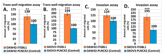 We also analyzed cellular migration rate using trans-well migration assay. Both OAW42 and SKOV3 cells with ITGBL1 overexpression showed significantly higher migration rate than isogenic control cells (p < 0.01 and p < 0.001, respectively; Figure 6A,B).