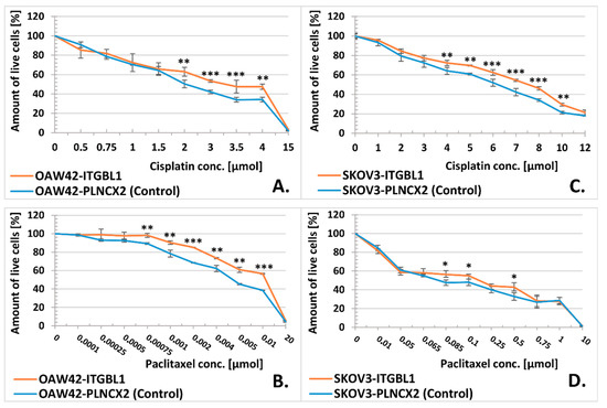 MTS assay for evaluation of cellular sensitivity to cisplatin (A,C) and paclitaxel (B,D). Y-axis represents percentage of live cells (mean ± SD, n = 3, each in 6 technical repeats) after 72 h of incubation with a drug, at an indicated concentration (X-axis). The absorbance of formazan from control (untreated) cells was taken as the reference value (100%). Statistical significance was assessed with Student’s t-Test; * indicates p < 0.05, ** p < 0.01, *** p < 0.001.