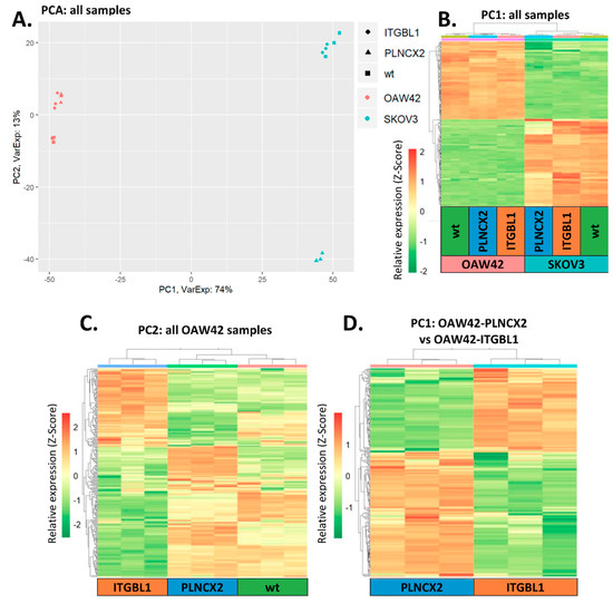 Unsupervised analysis of gene expression profiles in the analyzed cell lines. (A) Principal Component Analysis performed on all samples. Samples tend to group by the cell line. This difference is most prominent (74% of variance) and is described by first principal component (PC1). (B) Hierarchical clustering of all samples according to PC1. Heat map demonstrates that genes from PC1 have distinct expression pattern in OAW42 and SKOV3 cells. (C) Hierarchical clustering of OAW42 samples according to PC2. PC2 differentiates ITGBL1-overexpressing OAW42 samples from all control OAW42 samples (wild-type and with an empty pLNCX2). (D) Hierarchical clustering of OAW42 samples (only empty pLNCX2 controls and samples with ITGBL1 overexpression).