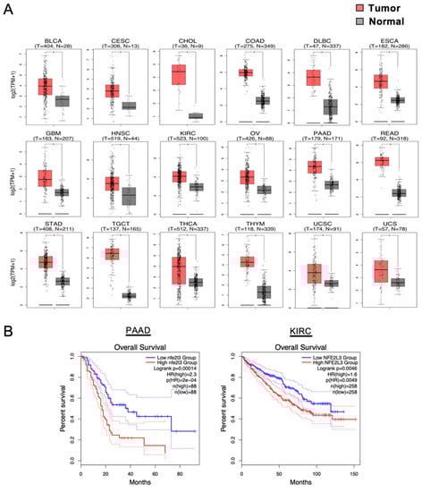 High upregulation of the NFE2-related factor 3 (NRF3) gene with malignancy. (A) Box plots depict the NRF3 gene expression profiles across multiple cancer types and in paired normal samples from the Gene Expression Profiling Interactive Analysis 2 (GEPIA2) web server []. Each red and gray box represents a tumor and adjacent normal specimen, respectively. * p < 0.05. BLCA, bladder urothelial carcinoma; CESC, cervical squamous cell carcinoma and endocervical adenocarcinoma; CHOL, cholangiocarcinoma; COAD, colon adenocarcinoma; DLBC, diffuse large B-cell lymphoma; ESCA, esophageal carcinoma; GBM, glioblastoma multiforme; HNSC, head and neck squamous cell carcinoma; KIRC, kidney chromophobe; OV, ovarian serous cystadenocarcinoma; PAAD, pancreatic adenocarcinoma (it is also annotated as PDAC—pancreatic ductal adenocarcinoma); READ, rectum adenocarcinoma; STAD, stomach adenocarcinoma; TGCT, testicular germ cell tumors; THCA, thyroid carcinoma; THYM, thymoma; UCEC, uterine corpus endometrial carcinoma; UCS, uterine carcinosarcoma. (B) Kaplan–Meier analyses comparing overall survival between groups expressing higher and lower levels of NRF3. The hazard ratio (HR) was calculated on the basis of Cox’s proportional hazards model. Data are from patients with PAAD and KIRC from GEPIA2.
