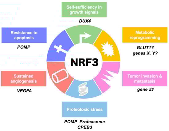 Involvement of NRF3 in the hallmarks of cancer. This illustration shows the six hallmark cancer capabilities originally proposed by Hanahan and Weinberg [] and modified in Luo et al. []. NRF3 confers cells with these capabilities by inducing the expression of the indicated genes. We are currently examining biological functions of X-Z genes in each hallmark. POMP, proteasome maturation protein; DUX4, double homeobox 4; GLUT1, glucose transporter 1; CPEB3, cytoplasmic polyadenylation element (CPE)-binding protein 3; VEGFA, vascular endothelial growth factor A.