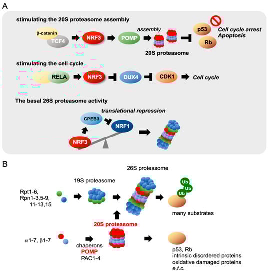 Three biological functions of NRF3 in cancer. (A) NRF3 exhibits three biological functions by regulating gene expression in colon cancer. (Top) In colorectal cancer cells, NRF3, the expression of which is induced by the β-catenin/T-cell transcription factor 4 (TCF4) complex, enhances the assembly of the 20S proteasome by inducing the proteasome maturation protein (POMP) chaperone gene. Consequently, the 20S proteasome degrades the tumor suppressors p53 and retinoblastoma (Rb) in a ubiquitin-independent manner, preventing cell cycle arrest and apoptosis. (Middle) NRF3 is also induced by the NF-kB complex, including RELA in colon cancer cells, and activates cell proliferation by repressing the CDK inhibitor DUX4 gene and consequently activating CDK1 []. (Bottom) NRF3 represses the translation of NRF1 by inducing cytoplasmic polyadenylation element-binding protein 3 (CPEB3) and modulates basal proteasome activity in colon cancer cells []. (B) Schematic representation of the molecular mechanisms of proteasome assembly. The 26S proteasome comprises 20S and 19S proteasomes containing 66 subunits [,,]. The assembly of each proteasome complex is tightly regulated in a coordinated manner by distinct chaperones. The 20S proteasome is assembled by proteasome assembling chaperone 1–4 (PAC1–PAC4) and POMP chaperones.